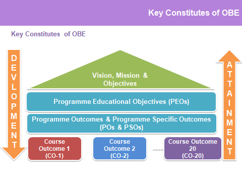 Outcome Based Education (OBE) is top down approach to comply with Vision, Mission, PEOs, POs and COs for development of academics and students. However, the bottom up approach is also followed to attain COs, POs, PEOs and VMO of department and institute through teaching learning process. The direct attainment from continuous assessment and indirect attainment from students, graduates, employers, alumni and parents feedbacks helps to achieve targeted attainment in OBE.